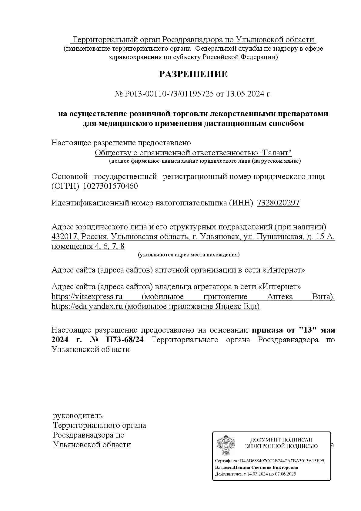 Контактные данные специалиста, ответственного за размещение информации о лекарственных препаратах на сайте аптеки Вита: Назарова Валерия Вадимовна, +7 (927) 655-03-28