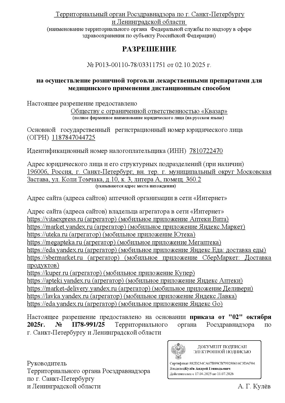 Контактные данные специалиста, ответственного за размещение информации о лекарственных препаратах на сайте аптеки Вита: Назарова Валерия Вадимовна, +7 (927) 655-03-28
