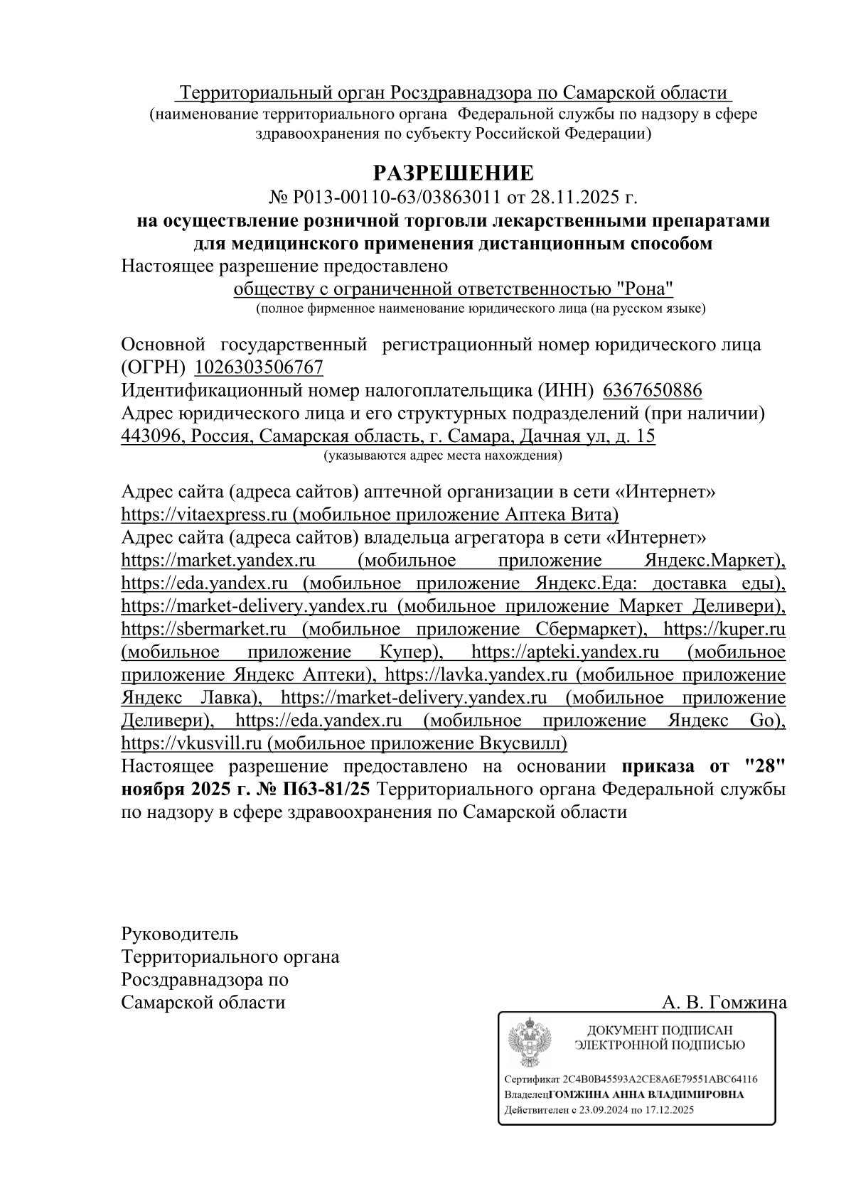 Контактные данные специалиста, ответственного за размещение информации о лекарственных препаратах на сайте аптеки Вита: Назарова Валерия Вадимовна, +7 (927) 655-03-28