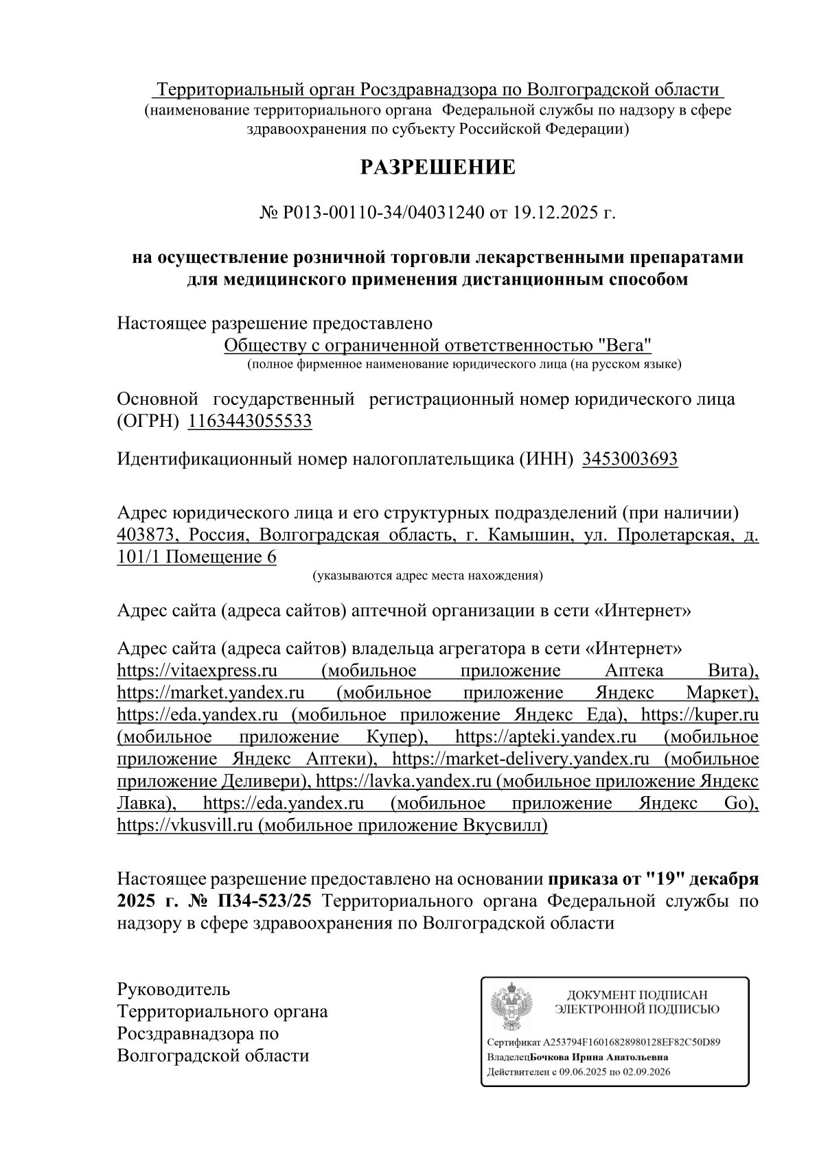 Контактные данные специалиста, ответственного за размещение информации о лекарственных препаратах на сайте аптеки Вита: Назарова Валерия Вадимовна, +7 (927) 655-03-28