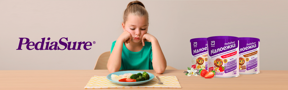 Недостаток питательных веществ можно восполнить за счёт напитка «Pediasure Малоежка» для детей от 1 до 10 лет. Он содержит белки, жиры, углеводы, 29 витаминов и минералов, омега-3 жирные кислоты и пробиотики и имеет доказанную эффективность: через месяц регулярного употребления у ребёнка улучшается аппетит и активность, через два месяца он начинает набирать вес (если была недостаточная масса тела), а через три месяца у него расширяется рацион питания — ребёнок ест более разнообразно.
