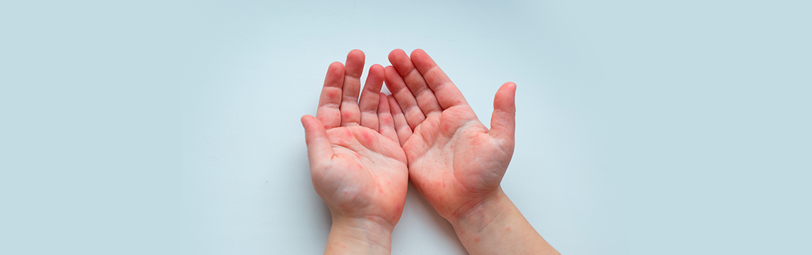 При такой инфекции появляется характерная сыпь в виде мелких розовых пятен или пузырьков. Ее можно найти на коже, во рту — на деснах и слизистой. Чаще всего пятнышки и пузырьки появляются вокруг рта, на лице, иногда даже под волосами на голове. Также характерные высыпания можно увидеть на верхней части тела, ладонях и ступнях.