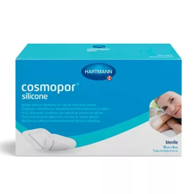 - Cosmopor Silicone – впитывающая повязка пластырного типа с контактным слоем из силикона для послеоперационных ран и неглубоких чистых ран с небольшим количеством отделяемого.