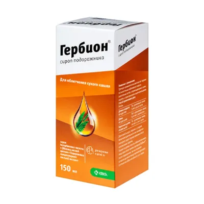Сироп на основе смеси экстрактов из листьев подорожника и цветков мальвы, с витамином С в составе. Препарат рекомендован к применению у взрослых и детей с 2 лет при заболеваниях верхних дыхательных путей, сопровождающихся сухим кашлем. Гербион обволакивает слизистую оболочку, помогает уменьшить воспаление и раздражение.