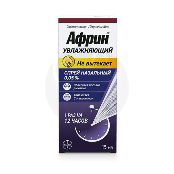 Препарат Африн® увлажняющий, спрей назальный, содержит действующее вещество оксиметазолина гидрохлорид. Оксиметазолин вызывает сужение сосудов слизистой оболочке носа, придаточных пазух и евстахиевой трубы, что приводит к уменьшению их отека и облегчению носового дыхания.