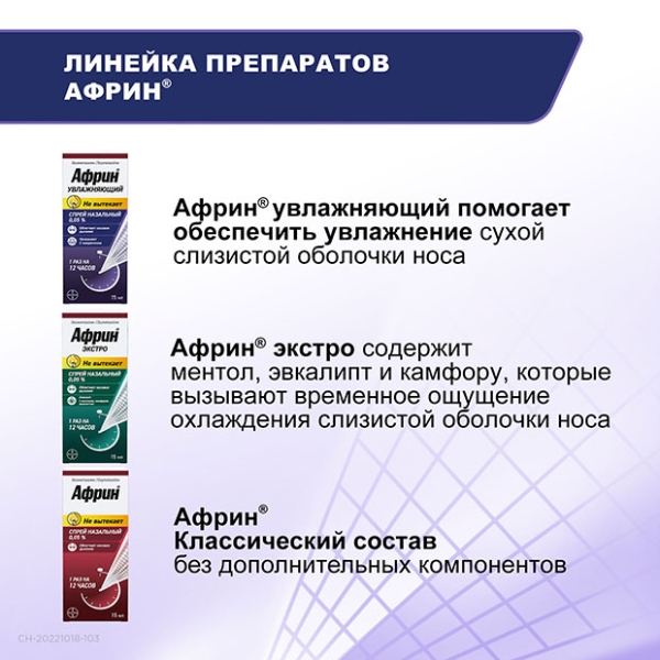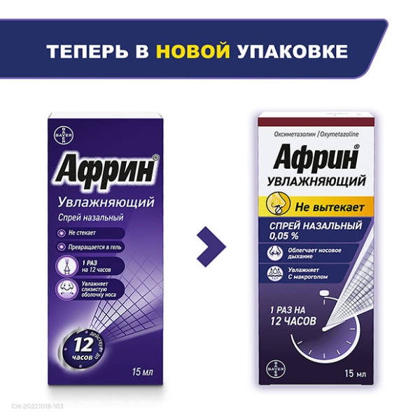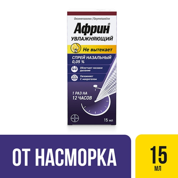 Препарат Африн® увлажняющий, спрей назальный, содержит действующее вещество оксиметазолина гидрохлорид. Оксиметазолин вызывает сужение сосудов слизистой оболочке носа, придаточных пазух и евстахиевой трубы, что приводит к уменьшению их отека и облегчению носового дыхания.