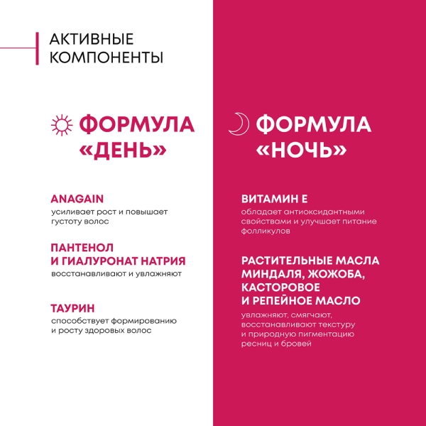 Двухфазный стимулятор с оригинальным сочетанием природных компонентов восстанавливает ресницы и брови, стимулирует их рост и возвращает природную пигментацию и густоту. Стимулятор содержит уникальную комбинацию активных ингредиентов, которые обеспечивают комплексное действие: