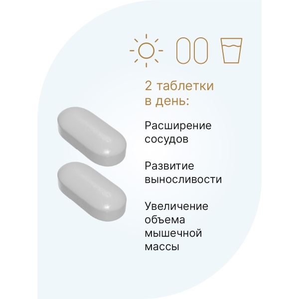 L-аргинин, целлюлоза микрокристаллическая (носитель), мальтодекстрин, компоненты пленочного покрытия (пищевые добавки): гидроксипропилметилцеллюлоза (загуститель), полиэтиленгликоль (глазирователь); диоксид кремния аморфный и стеарат магния (агенты антислеживающие), крахмал кукурузный.
