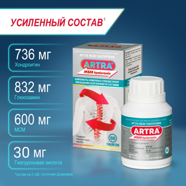 ✓ Купить Артра МСМ Гиалуроник таблетки покрыт. п/о, №60 можно на сайте, в мобильном приложении и в аптеках Вита