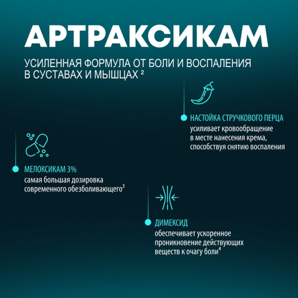 Препарат Артраксикам содержит действующие вещества мелоксикам и перца стручкового плодов настойку и относится к группе нестероидных противовоспалительных препаратов. Артраксикам оказывает противовоспалительное, обезболивающее, противоотечное действие. Может вызвать легкую локальную гиперемию кожи, не оказывая при этом выраженного раздражающего действия на кожные покровы.
