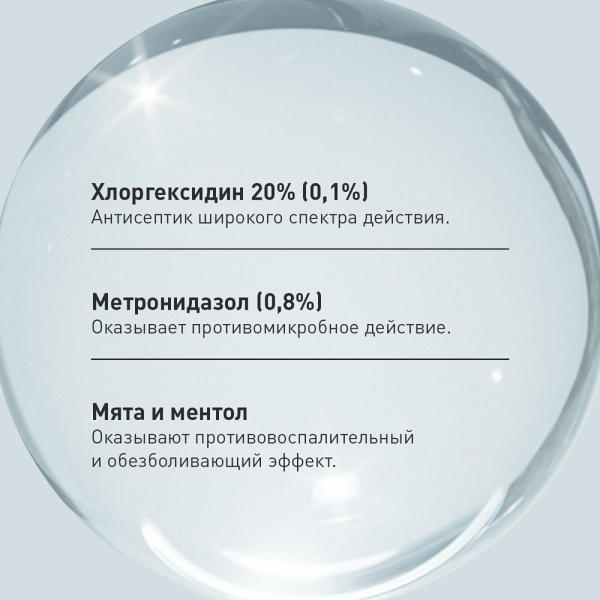 Комбинированное противомикробное средство, предназначенное для применения при воспалительных заболеваниях полости рта. Уменьшает воспаление и кровоточивость дёсен, активен в отношении болезнетворных бактерий, снижает повышенную чувствительность дёсен.