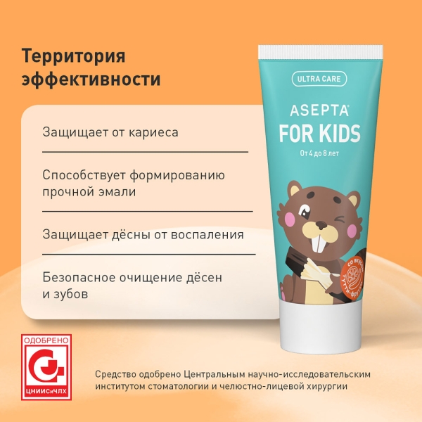 Зубная паста ASEPTA KIDS рекомендована для очищения молочных и постоянных зубов малышей в возрасте от 4 до 8 лет. Безопасна при случайном проглатывании.