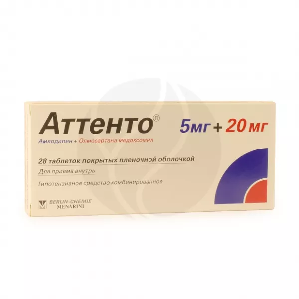 Препарат Аттенто® содержит два действующих вещества: олмесартана медоксомил и амлодипина безилат. С помощью этих двух веществ осуществляется контроль за повышенным артериальным давлением (АД). Препарат Аттенто® относится к фармакотерапевтической группе комбинированных гипотензивных средств.