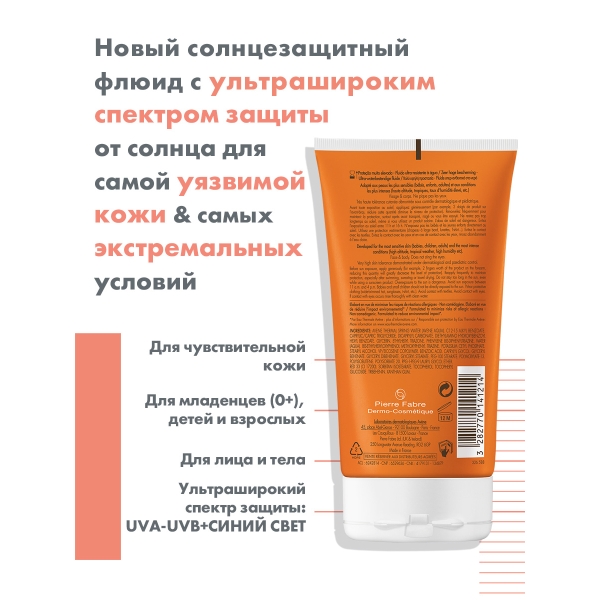 Авен Интенс Протект Ультра-водостойкий солнцезащитный флюид SPF50+ – это средство с очень высокой степенью защиты от солнца, предназначенное для защиты чувствительной кожи лица и тела в условиях экстремальной инсоляции, например: тропический климат, высокогорье, высокая влажность. Средство подходит для младенцев, детей и взрослых.