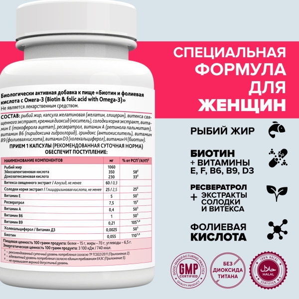 Комплекс с биотином и фолиевой кислотой включает десять активных компонентов в биодоступной форме, которые способствуют нормализации гормонального фона у женщин при стрессе и неблагоприятных внешних факторах. А также поддерживают работу нервной, эндокринной и сердечно-сосудистой систем. Биотин участвует в обмене веществ, способствует улучшению состояния кожи, укреплению волос и ногтей. Фолиевая кислота необходима для нормального деления клеток. Омега-3 жирные кислоты оказывают общеукрепляющее действие, поддерживают работу сердца и способствуют снижению воспалительных процессов.
