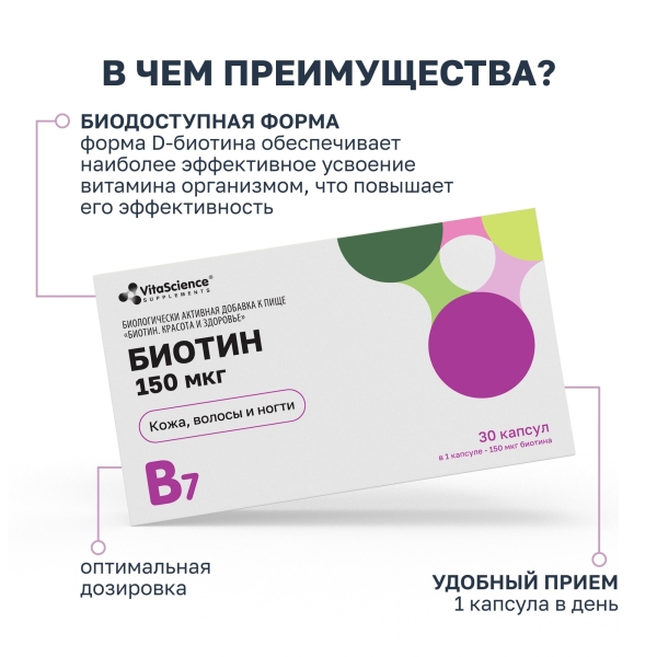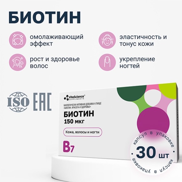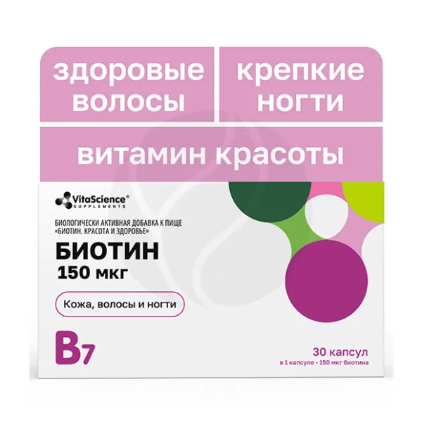 ✓ Цена на Vitascience Биотин капсулы 150мкг, №30 указана на сайте и в мобильном приложении
