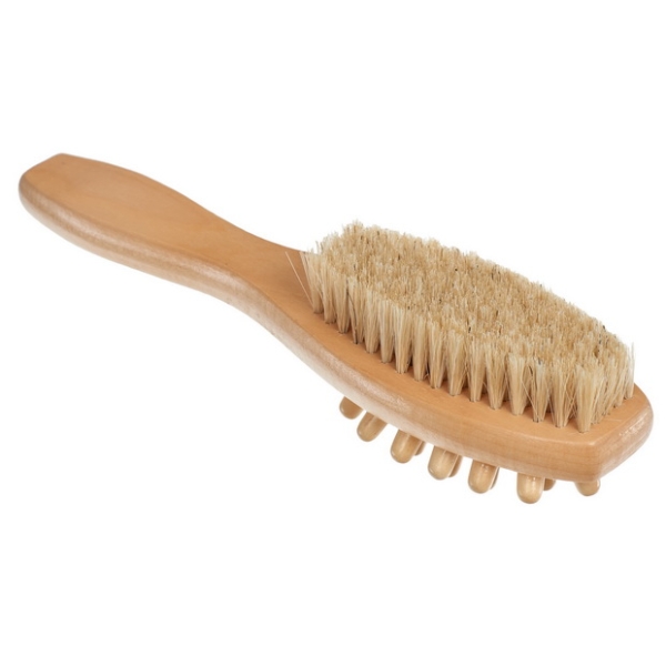 Деревянная щетка с щетиной кабана средней жесткости позволит насладиться всеми преимуществами сухого массажа. Натуральный ворс обеспечивает комфортное воздействие на кожу без царапин. Использование щетки обеспечивает легкий пилинг кожи тела, помогает бороться с целлюлитом и предупреждает врастание волос. Массажная щетка для тела имеет удобную отполированную деревянную ручку и петельку для подвешивания на крючок.