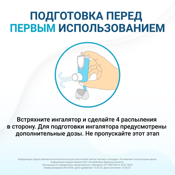 Ингалятор хранить в закрытом пакете — ингалятор следует достать из закрытого пакета непосредственно перед первым применением. В день вскрытия пакета напишите дату на картонной пачке в специально отведённом поле.