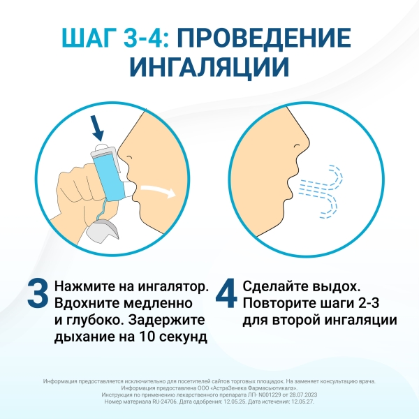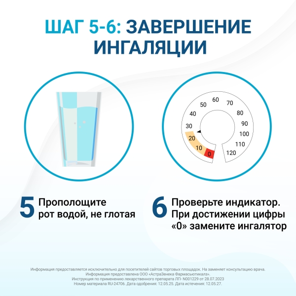 Рекомендуемая доза составляет две ингаляции два раза в сутки — две ингаляции утром и две ингаляции вечером.