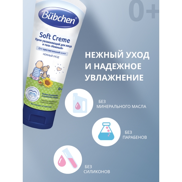 Легкая консистенция крема "масло в воде" позволяет ему мгновенно впитывается кожей и оставляет приятное ощущение. Чистые растительные масла и увлажняющие ингредиенты ухаживают за нежной кожей и защищают ее от пересыхания. Содержит комплекс «БЮБХЕН - АКТИВНАЯ ЗАЩИТА КОЖИ», который сохраняет влагу в коже. Масло миндаля, карите и подсолнечника восстанавливают защитный липидный барьер, пантенол, гелиотропин и витамин Е - увлажняют и препятствуют возникновению раздражения. Использовать с рождения.