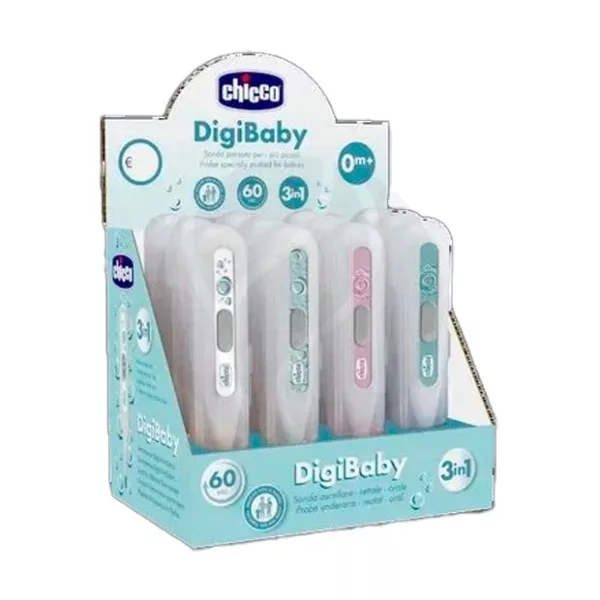 Термометр DigiBaby 3-в-1,цифровой,в футляре от Chicco измеряет температуру за 60 секунд, имеет высокую точность измерения, подает сигнал об окончании измерения и при повышенной температуре. Преимущество термометра DigiBaby - возможность измерить температуру любым из 3-х способов: под мышкой, орально или ректально.