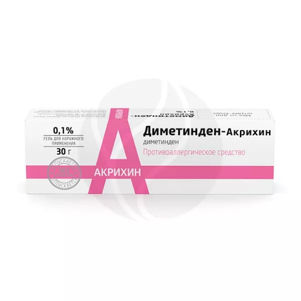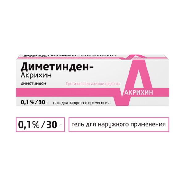 Антигистаминное, противоаллергическое и противозудное средство. Блокатор H1- гистаминовых рецепторов, является конкурентным антагонистом гистамина. Препарат снижает повышенную проницаемость капилляров, связанную с аллергическими реакциями. При нанесении на кожу Диметинден-Акрихин гель уменьшает зуд и раздражение, вызванные кожно-аллергическими реакциями. Препарат обладает также выраженным местноанестезирующим эффектом. Оказывает также антикининовое и слабое антихолинергическое действие. При наружном применении, благодаря гелевой основе, обладает быстрым началом действия (через несколько минут) и легким охлаждающим эффектом. Максимальный эффект – через 1-4 часа.