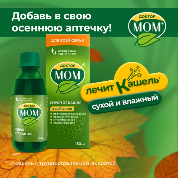Препарат Доктор Мом® – комбинированный препарат растительного происхождения, обладающий бронхолитическим (расширяет бронхи), муколитическим (разжижает мокроту), отхаркивающим и противовоспалительным действием.