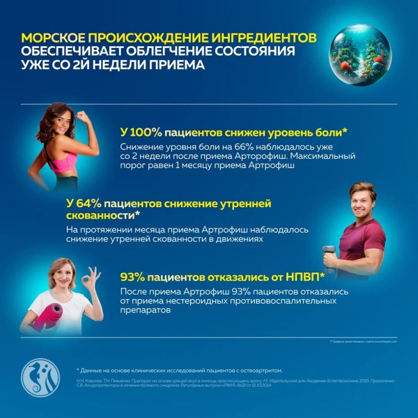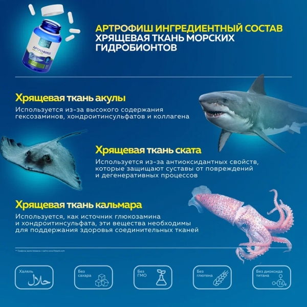 Артрофиш - натуральный морской хондропротектор для поддержания здоровья суставов и связок. В составе ингредиентов более 30 биоактивных веществ – компонентов хрящевой ткани, которые помогают укрепить хрящи и связки, а также снизить воспаленвоспаление и боль в суставах. Капсулы рекомендуются для профилактики заболеваний суставов, а также для лечения 1-2 стадии артроза сустава и других заболеваний опорно-двигательного аппарата.