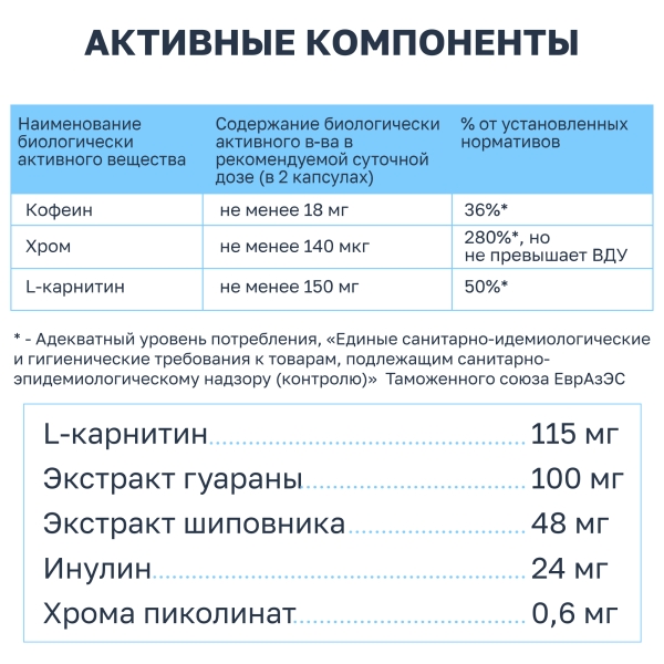L-карнитин, экстракт гуараны, желатин (оболочка капсулы), наполнитель лактоза, экстракт шиповника, инулин, диоксид кремния аморфный (аэросил) и стеарат кальция (агенты антислеживающие), хрома пиколинат, красители пищевые (оболочка капсулы): диоксид титана, индиготин, оксид железа желтый, оксид железа черный; или оксид железа красный, диоксид титана; или кандурин серебряный сатиновый блеск; или диоксид титана.