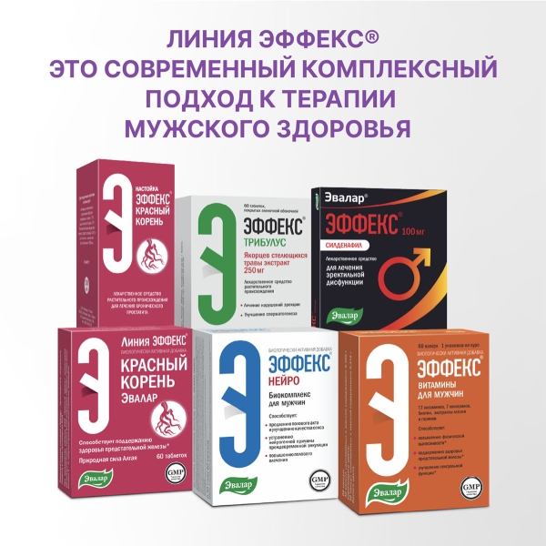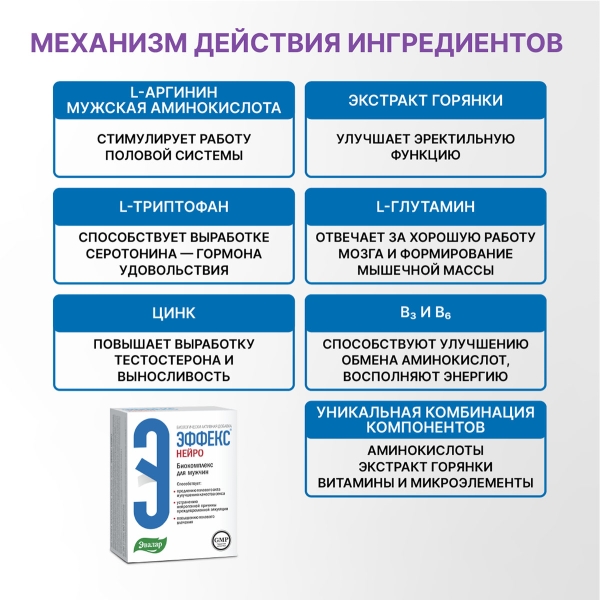Биокомплекс для мужчин способствует: устранению нейрогенной причины преждевременной эякуляции, защищает от негативного влияния стресса и способствует повышению либидо, продлению полового акта и улучшению качества секса; улучшает потенцию и сперматогенез.