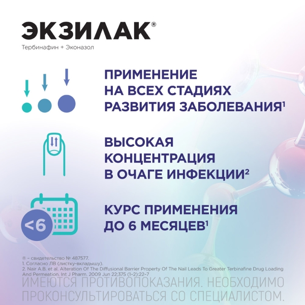 Не применяйте препарат Экзилак, если у Вас аллергия на тербинафин, эконазол или любые другие компоненты препарата (перечисленные в разделе 6 листка-вкладыша).