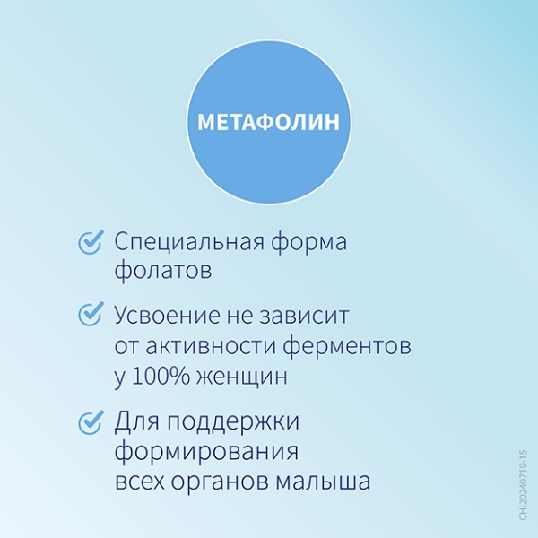 Метафолин® является современной формулой фолиевой кислоты, которая не требует дополнительной активации ферментами. Данная комбинация обеспечивает поддержку правильного формирования сердца и мозга ребенка.