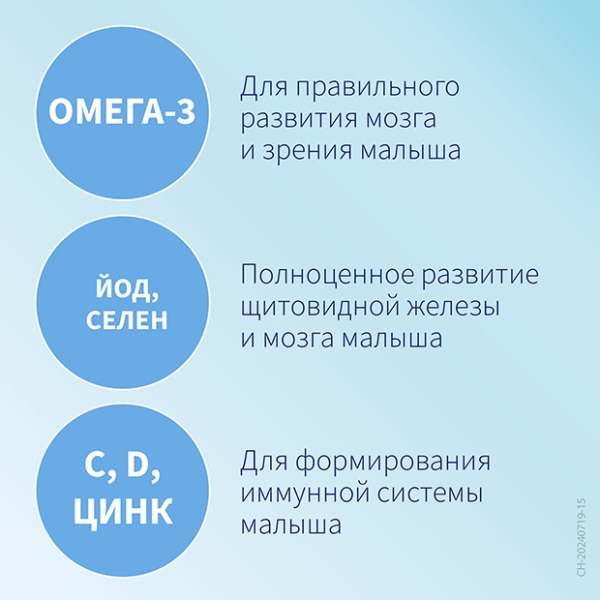Незаменимые ненасыщенные жирные кислоты омега-3 являются основными структурными компонентами клеток сетчатки глаза и головного мозга (мозг человека на 60 % состоит из жиров). В комбинации омега-3 (ДГК 200 мг и ЭПК 80 мг) и йод (150 мкг) обеспечивают правильное развитие мозга и зрения ребенка. Высокая степень очистки омега-3 гарантирует качество продукта.