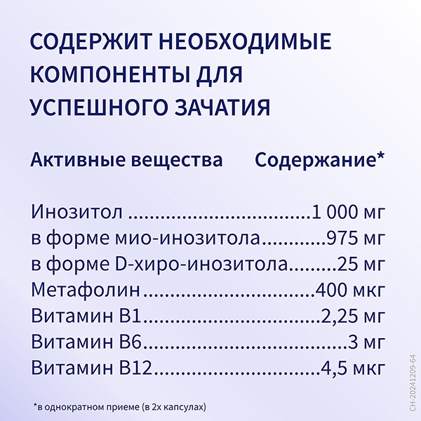 Инозитол в двух активных формах – мио-инозитол, который активирует метаболизм, и D-хиро-инозитол, который нормализует уровень половых гормонов. Они содержатся в пропорции 40:1, что соответствует их физиологическому соотношению в плазме крови человека. Именно такая комбинация наилучшим образом поддерживает нормальный менструальный цикл.