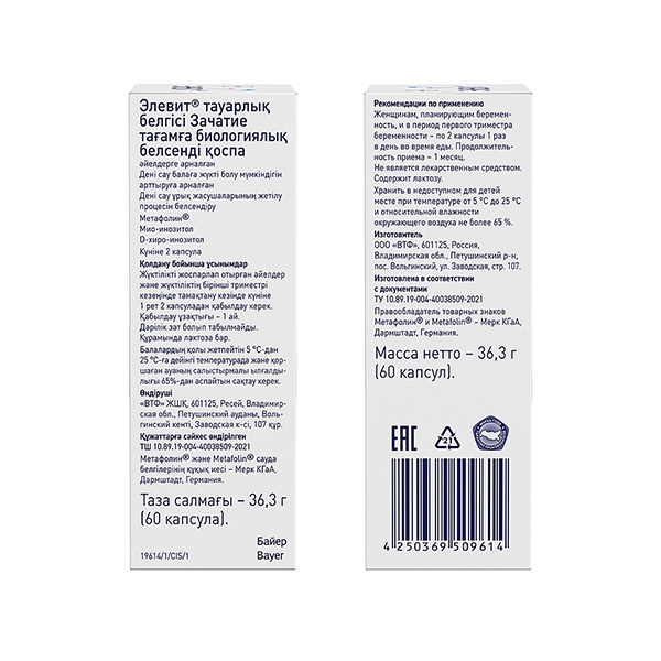 Инозит (в форме мио-инозитола и D-хиро-инозитола), капсула желатиновая (желатин) краситель диоксид титана), агенты антислеживающие: диоксид кремния аморфный и магниевая соль стеариновой кислоты, пиридоксина гидрохлорид тиамина гидрохлорид, лактоза, кальция L-метилфолат, цианокобаламин.
