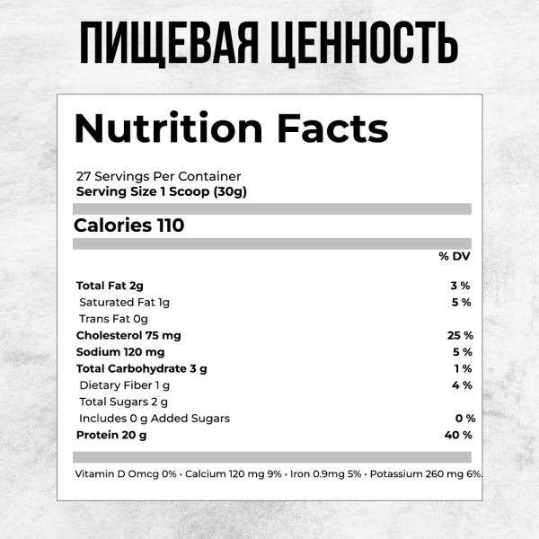 Смесь 100% сывороточного протеина животного происхождения [концентрат сывороточного протеина (подсолнечный или соевый лецитин), изолят сывороточного протеина (лецитин)], натуральные и искусственные ароматизаторы, смесь камеди (целлюлозная камедь, ксантановая камедь, каррагинан), хлорид натрия, ацесульфам калия, сукралоза.