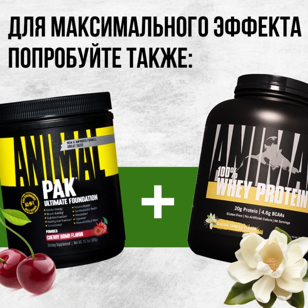 Animal 100% Whey представляет собой смесь ультрафильтрованного концентрата сывороточного протеина и микрофильтрованного изолята сывороточного белка. Протеин премиального качества способствует быстрому росту мышц, улучшает выносливость, защищает волокна мышц от разрушений. Порция шоколадного или ванильного напитка с приятным неприторным вкусом, приготовленного из 1 ложки порошка, содержит 20 г наиболее быстро усваиваемого сывороточного протеина — источника необходимых организму спортсмена аминокислот.