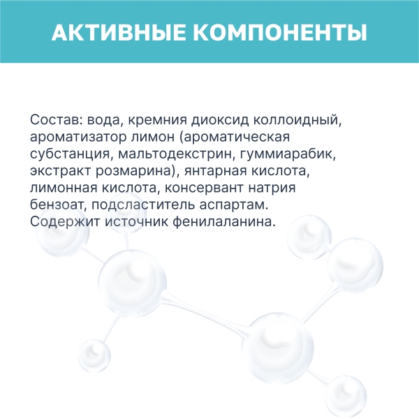 Вода, кремния диоксид коллоидный, ароматизатор лимон (ароматическая субстанция, мальтодекстрин, гуммиарабик, экстракт розмарина), янтарная кислота, лимонная кислота, консервант натрия бензоат, подсластитель аспартам. Содержит источник фенилаланина.