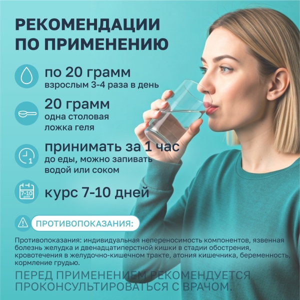 Взрослым по 20г 3-4 раза в день. Одна столовая ложка геля - 20г. Можно запивать водой или соком. Принимать за 1 час до еды.