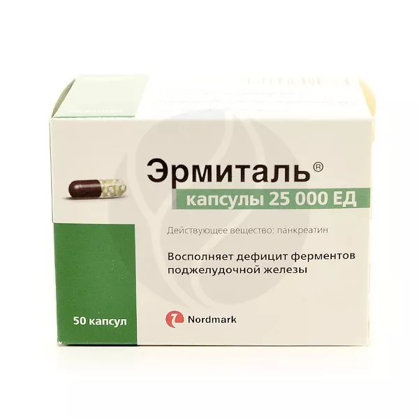 Эрмиталь® содержит стандартный высокоактивный панкреатин, полученный из поджелудочной железы свиньи в виде микротаблеток, резистентных к воздействию желудочного сока. Форма выпуска препарата обеспечивает полное высвобождение резистентных к действию желудочного сока микротаблеток из капсулы в желудке с последующим мелкодисперсным перемешиванием микротаблеток с кишечным содержимым и химусом и быстрым выделением ферментов из микротаблеток в двенадцатиперстной кишке.