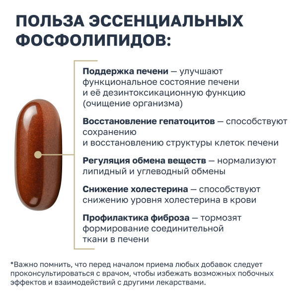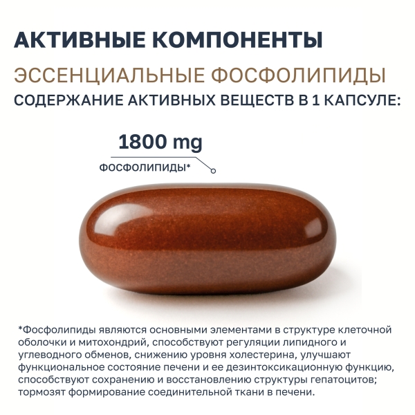 Прием в рекомендованной дозировке (3 капсулы в день) обеспечивает поступление эссенциальных фосфолипидов (в пересчете на фосфотидилхолин) - 1800 мг.
