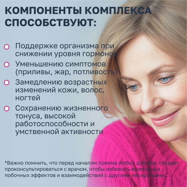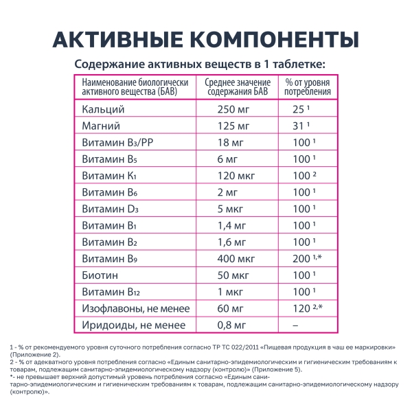 Кальция карбонат, носитель: микрокристаллическая целлюлоза Е460(i), магния оксид, экстракт семян сои, экстракт плодов витекса священного, носитель: гидроксипропилметилцеллюлоза Е464, антислёживающий агент: тальк, Е553(iii), никотинамид, носитель: поливинилпирролидон Е1201, антислёживающий агент: магния стеарат Е470, носитель: мальтодекстрин, краситель: диоксид титана Е171, антислёживающий агент: диоксид кремния аморфный Е551, носители карбоксиметилцеллюлозы натриевая соль Е466, кроскарамеллоза натрия Е468, влагоудерживающий агент: пропиленгликоль Е1520, кальция пантотенат, фитоменадион, пиридоксина гидрохлорид, холекальциферол, тиамина гидрохлорид, рибофлавин, фолиевая кислота, краситель: синий блестящий Е133, биотин, цианокобаламин.