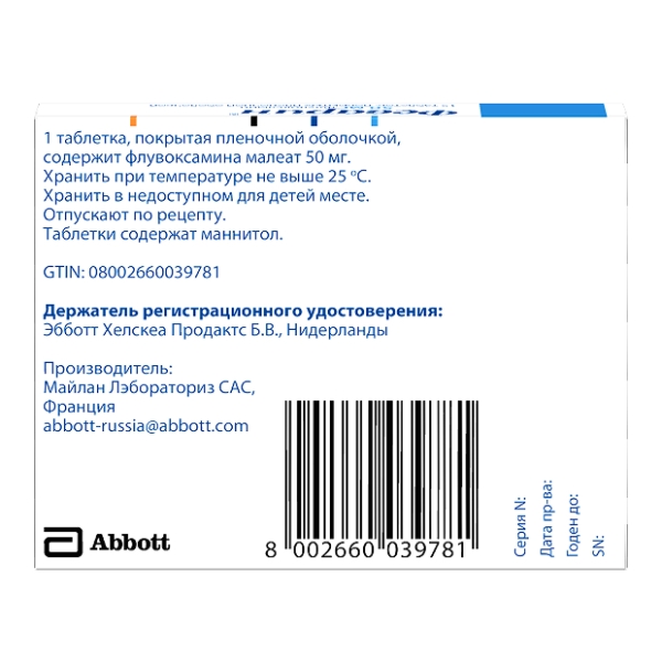 Каждая таблетка, покрытая пленочной оболочкой, содержит 50 мг флувоксамина (в виде флувоксамина малеата).