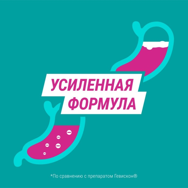 Действующие вещества: натрия альгинат 250 мг, натрия гидрокарбонат 106,5 мг, кальция карбонат 187,5 мг;