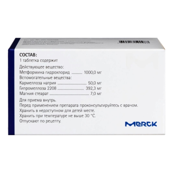 Действующее вещество: метформина гидрохлорид - 1000,0 мг;