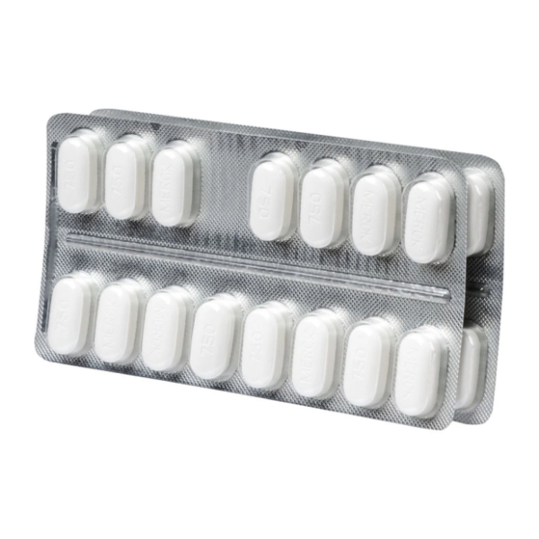 Капсуловидные, двояковыпуклые таблетки белого или почти белого цвета, с гравировкой "750" на одной стороне и "MERCK" - на другой.