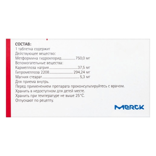 Действующее вещество: метформина гидрохлорид - 750 мг