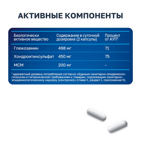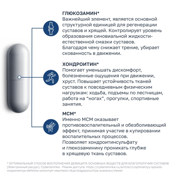 Глюкозамин гидрохлорид, хондроитинсульфат натрия, оболочка капсулы (желатин), метилсульфонилметан (МСМ), магниевая соль стеариновой кислоты, (агент антислеживающий), поливинилпирролидон (стабилизатор), диоксид кремния аморфный (агент антислеживающий).