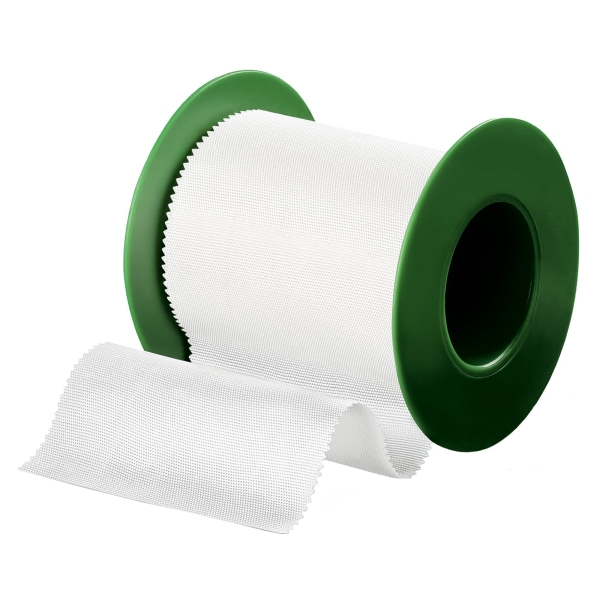 Гипоаллергенный фиксирующий пластырь из белого искусственного шёлка с синтетическим каучуковым клеем.