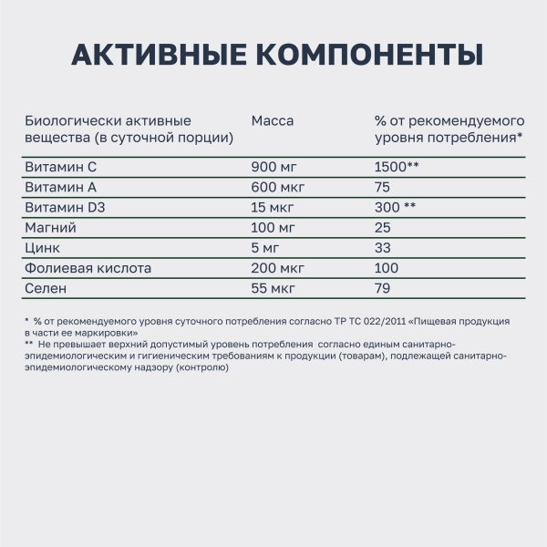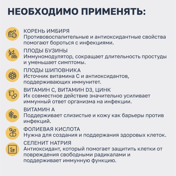 Сорбитол – носитель, витамин C (L-аскорбиновая кислота), регуляторы кислотности: гидрокарбонат натрия, лимонная кислота, магния цитрат, цикламат натрия – подсластитель, сухой экстракт корня имбиря, полиэтиленгликоль 6000 – стабилизатор, сухой экстракт плодов бузины, сухой экстракт плодов шиповника, мальтодекстрин, ароматизатор лимона, оксид цинка, витамин D3 (холекальциферол), сухой экстракт корня куркумы, витамин A (ретинола ацетат), фолиевая кислота, селенит натрия.